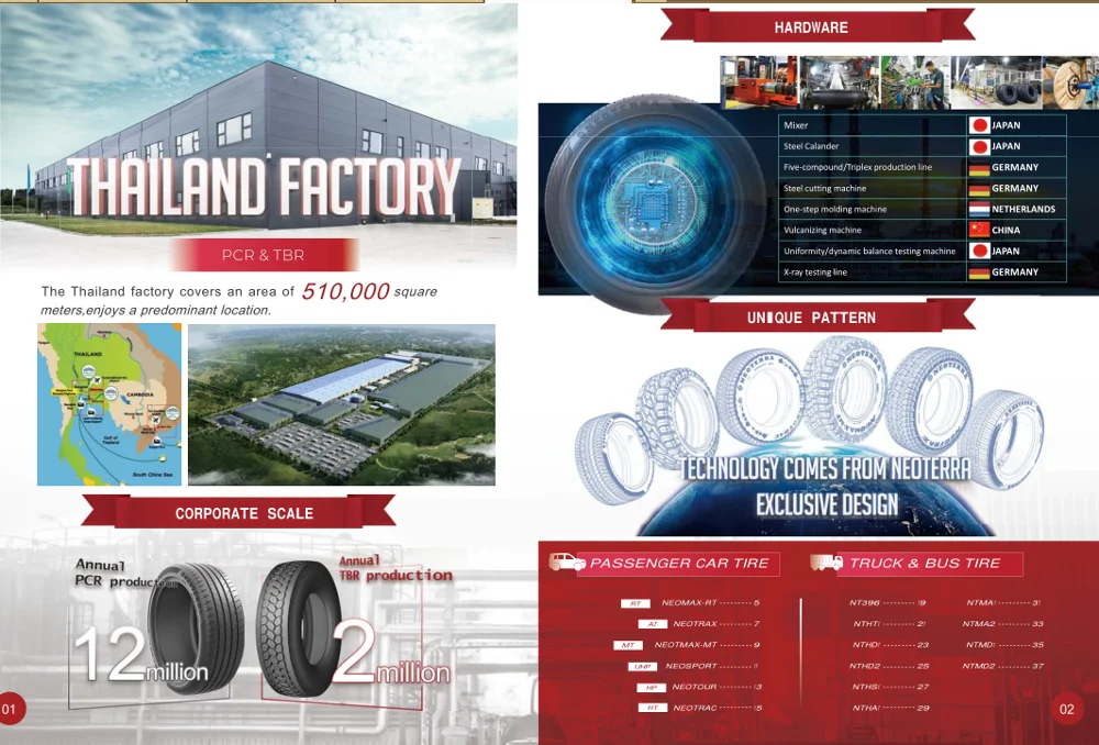 Complete Size List. Neoterra Thailand PCR is from 15 inches to 24 inches, includes HP, UHP, H/T, A/T, M/T, R/T etc. The TBR range is from 215 to 445, including all popular size and popular pattern.