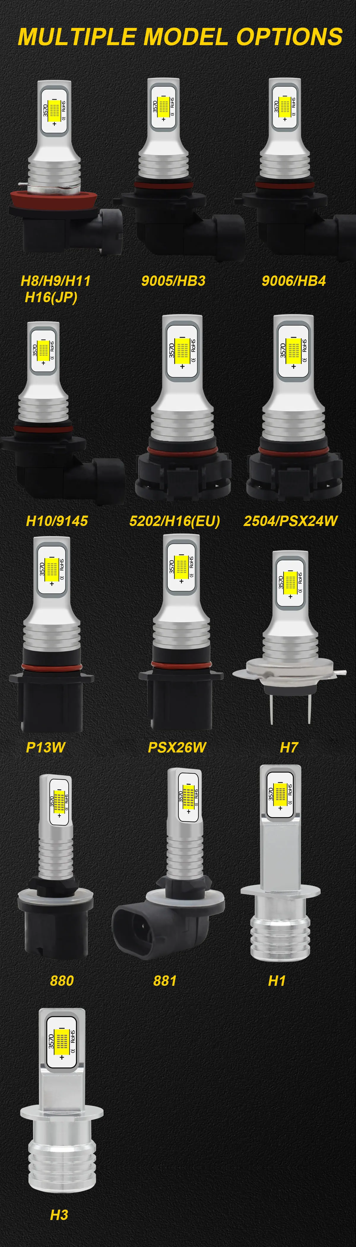 - Socket: H8 H11 / HB4 9006 HB3 9006 / H1 H3 / H7 / P13W PSX26W / 5202 H16 PSX24W / H27/880 H27/881