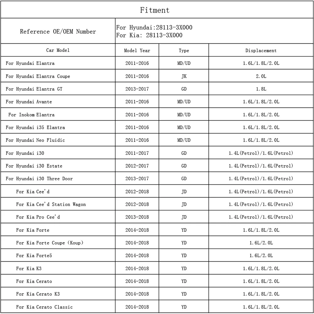 Reference OE/OEM Number: For Hyundai: 28113-3X000, For Kia: 28113-3X000