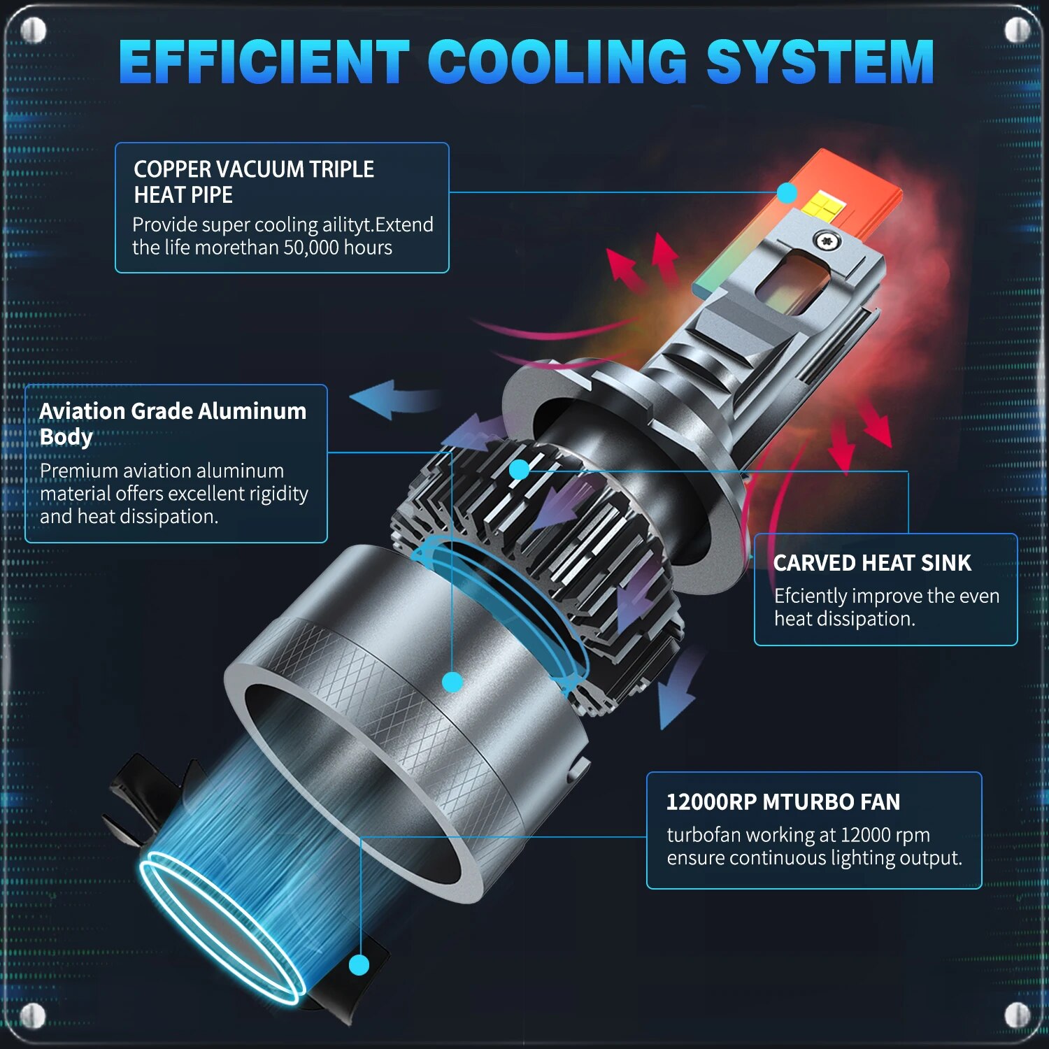 13.Heat Dissipation Theory : 2.0 copper light board,Aviation aluminum 6063, 12000RPM