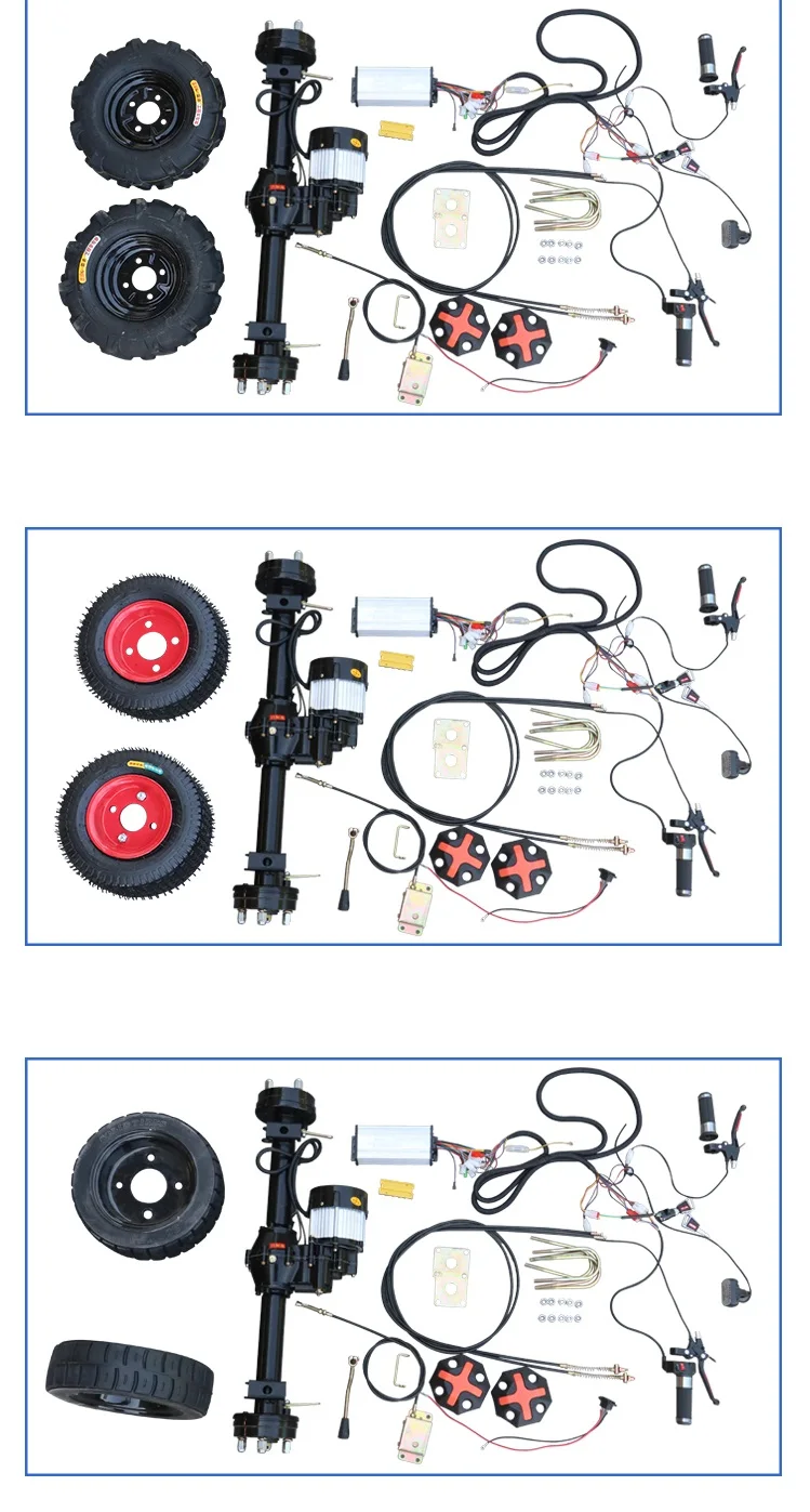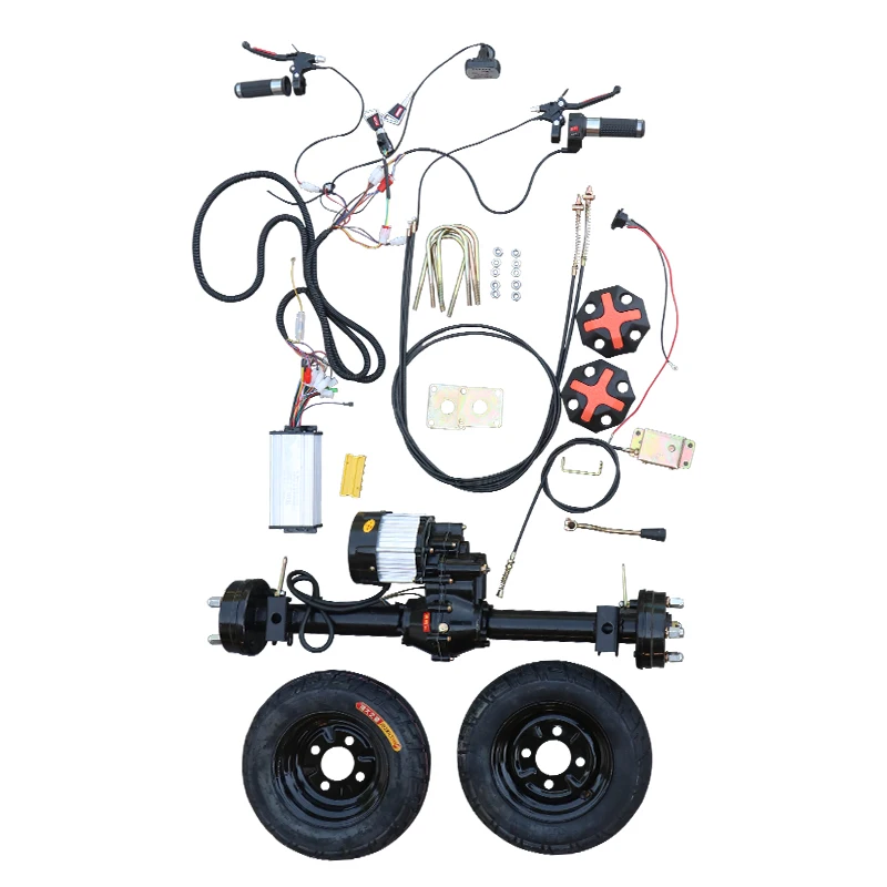 Rear axle(49cm-120cm can be customized )+controller+motor+differential package+shifter+handbrake+brake line+connection harness+speed handle + electric lock+electricity meter+charging port+five-hole plate U-shaped wire+junction box +Decorative cover+Tires (tire diameters are 25cm, 35cm, 45cm, 50cm, 55cm) herringbone wheels, deep pattern, light pattern tires, solid wheels, track wheels are available! Pls contact us free for the details.