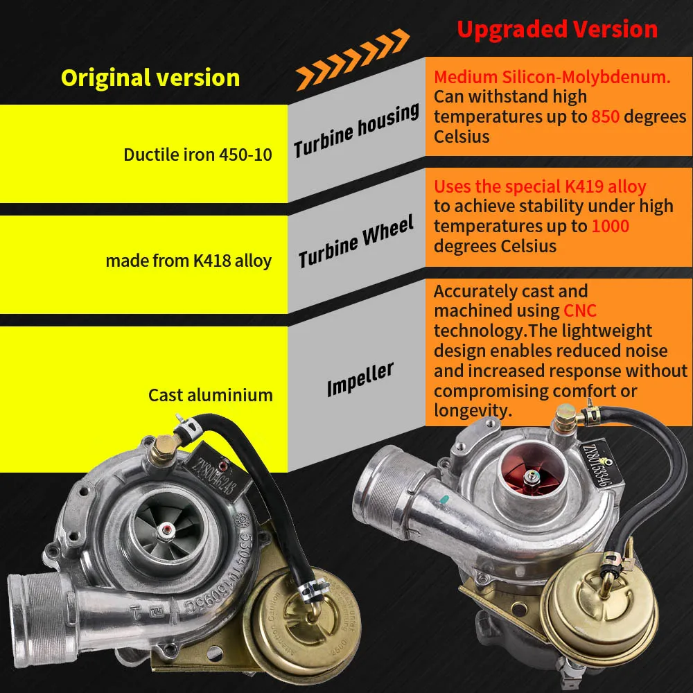 (1)Street-performance upgraded turbocharger with higher performance than the normal version: Flows more volume and sustains higher boost pressures than the standard K03