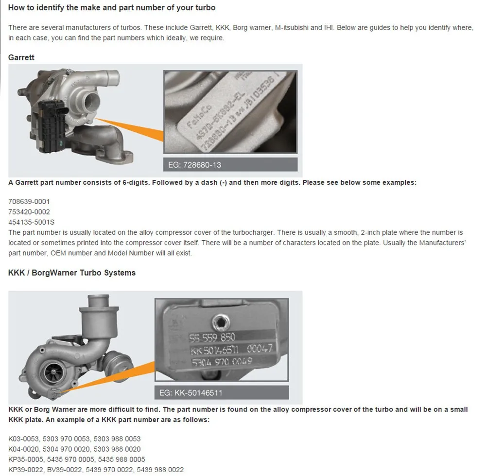 * Please check the Turbo Model, Turbo Part Number and OEM Part Number on your original turbo to make sure it’s the right one for your engine. If you are not sure about these information, please feel free to contact us