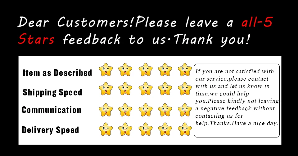 If you are satisfied with our products,please kindly leave a all 5-stars feedback to us,it will be a great encourage to us.If there is any problem,contact with us instead of leaving a negative feedback.We will try our best to solve the problem.